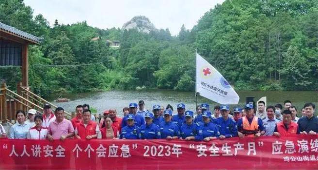 現場以“雞公山景區境內暴雨持續2小時,河道水位上漲速度較快,可能發生洪澇災害,收到汛情報告,指揮部立即啟動應急預案,指揮長隨即啟動應急響應,通過手搖報警器、敲鑼等方式發布緊急轉移指令和人員轉移實戰演練。”